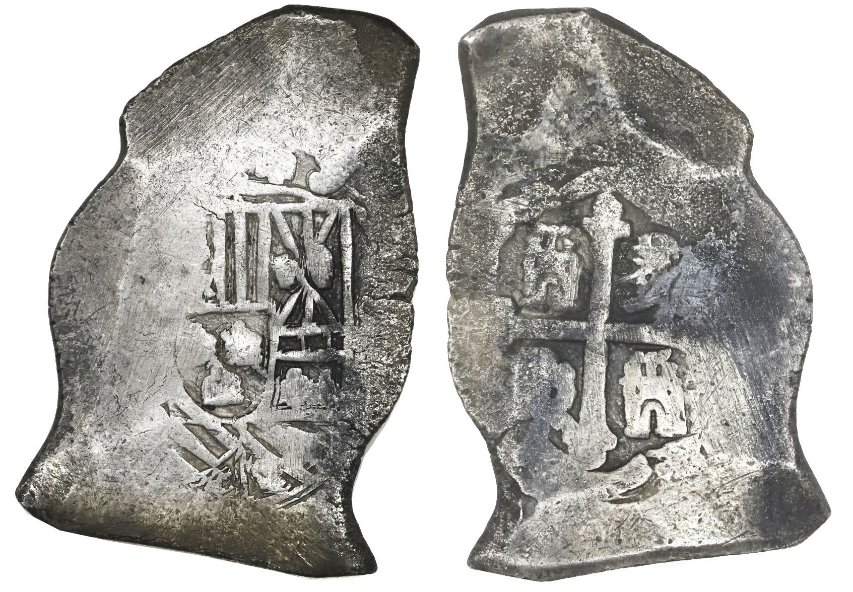 Mexico City, Mexico, cob 8 reales, Philip V, assayer not visible. KM-47. 24.89 grams. Solid and uncorroded (despite the light weight), nearly full shield and cross, flat peripheries, some areas of dark "horn silver." Recovered from: Spanish 1715 Fleet, east coast of Florida