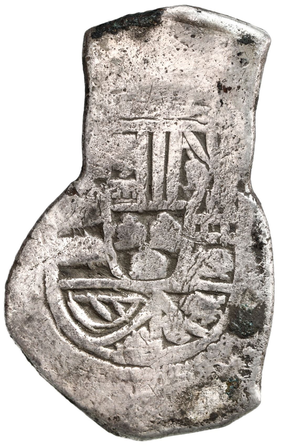 Mexico City, Mexico, cob 8 reales, Philip V, assayer not visible. KM-47. 26.20 grams. Fascinating shape, like a fat bottle with wide long neck, nicely aligned with both the full shield and the partial cross, peripherally flat but virtually uncorroded, spots of dark "horn silver" here and there. Pedigreed to the J.P. Silberman Estate.Recovered from: Spanish 1715 Fleet, east coast of Florida.