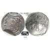 Mexico City, Mexico, cob 8 reales, (ca. 1618)D/F, Grade 1. S-M18; KM-44.3. Very thick and solid flan (no corrosion) with bold oMD/F, good full shield and cross, most of crown and denomination, lightly toned. Encapsulated by NGC and with Arqueonautas certificate #1973918011, with wooden presentation box. From the Sao Jose, sunk in 1622 off Mozambique, east of Africa