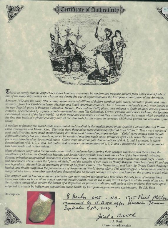 Mexico City, Mexico, cob 8 reales "greenie" (encrusted as found), Philip V, assayer J, ex-Hurricane Jeanne. S-M22; KM-47. 26.49 grams. Solid flan with about 80% covered with greenish encrustation but one corner exposed to reveal a full oMJ and small part of date, dark all over. With 2004 photo-certificate from finder Joel Ruth stating recovery after Hurricane Jeanne. Recovered from: Spanish 1715 Fleet, east coast of Florida