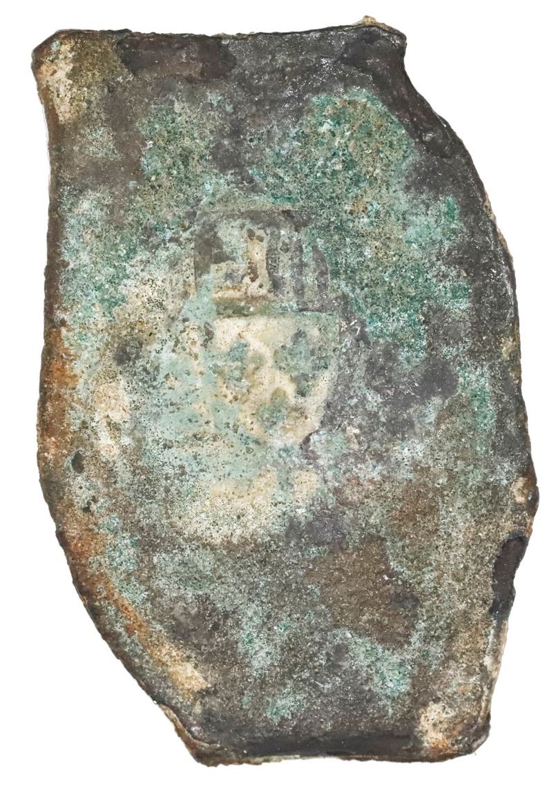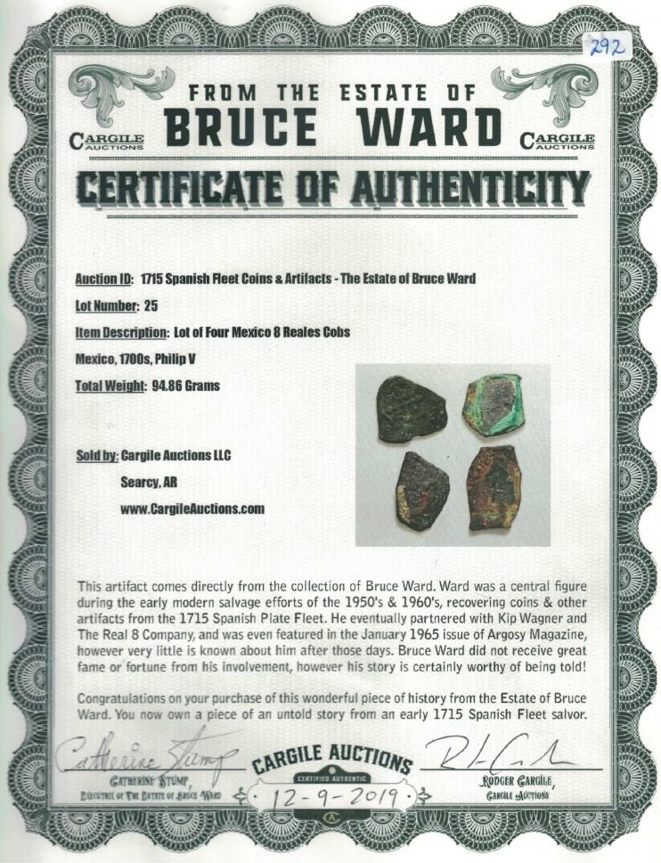 Mexico City, Mexico, cob 8 reales "greenie" (encrusted as found), Philip V, assayer not visible, ex-Ward. 23.71 grams. Elongated flan with thick, colorful encrustation (green, tan, white, orange and dark brown), clear Philip V shield and most of cross. Pedigreed to the Bruce Ward collection (Cargile auction of December 2019, lot #25 [group lot], with original tag and photo-certificate). Recovered from: Spanish 1715 Fleet, east coast of Florida