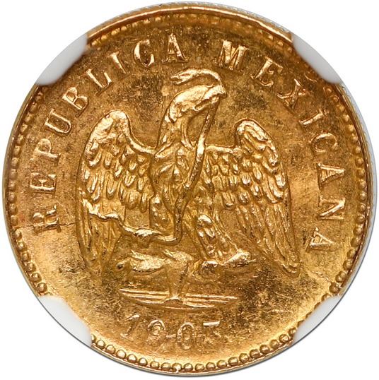 Mexico City, Mexico, gold 1 peso, 1903 M, small date variety, NGC MS 64. KM-410.5. Highly lustrous (especially on the eagle side) with tall rims and sharp details, low mintage of 10,000 coins for both varieties.
