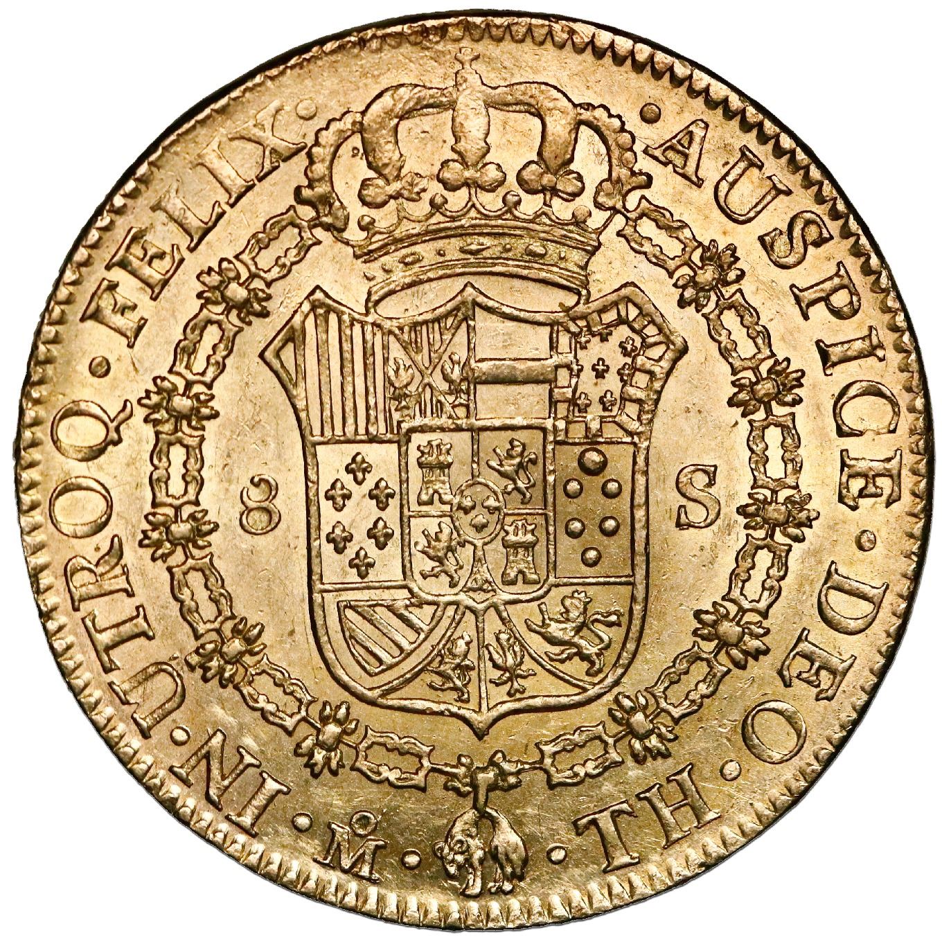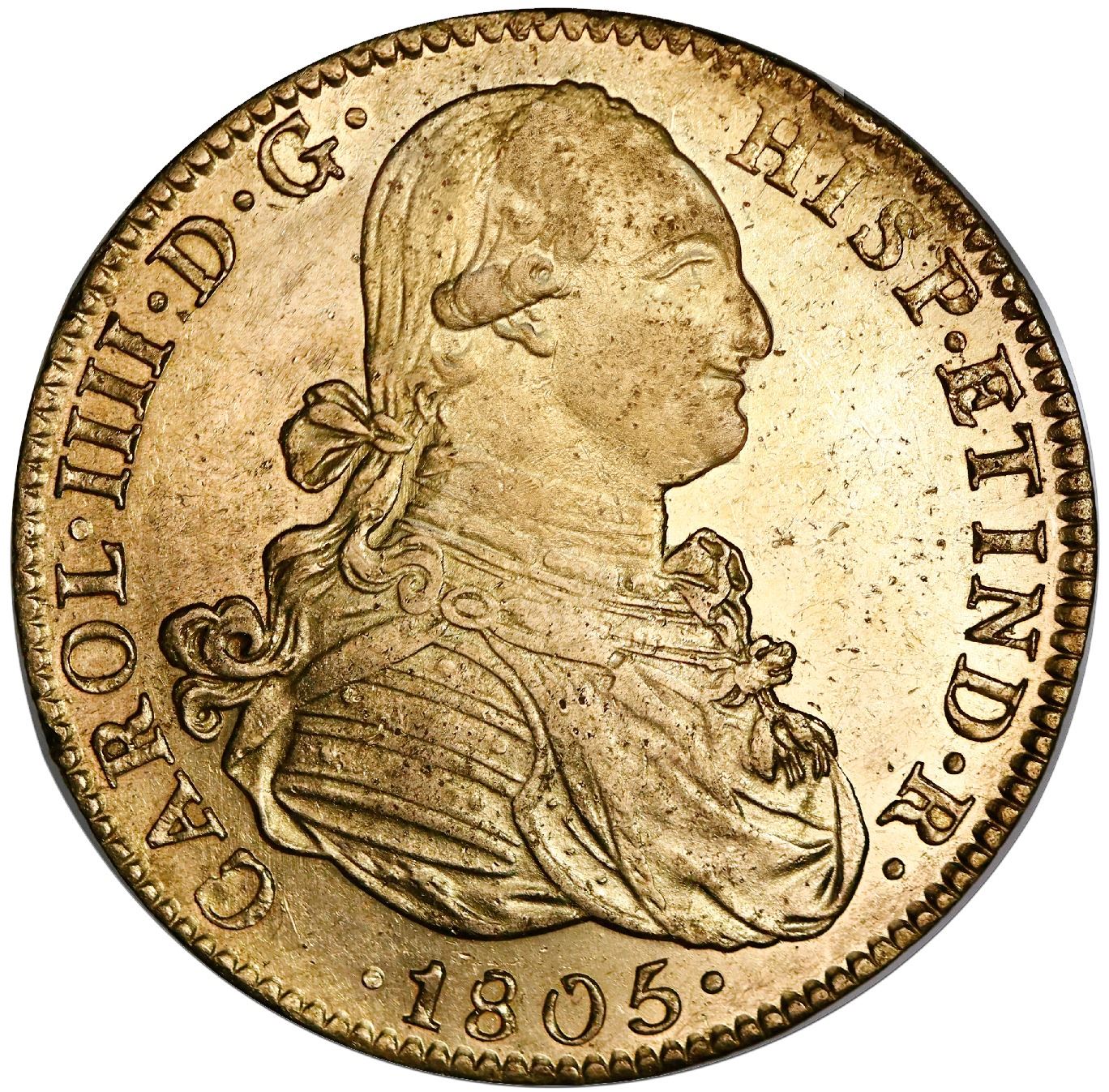 Mexico City, Mexico, gold 8 escudos, Charles IV, 1805TH. Cal-1649; KM-159. 27.00 grams. Highly lustrous UNC with faint surface hairlines, parts of rims weak.