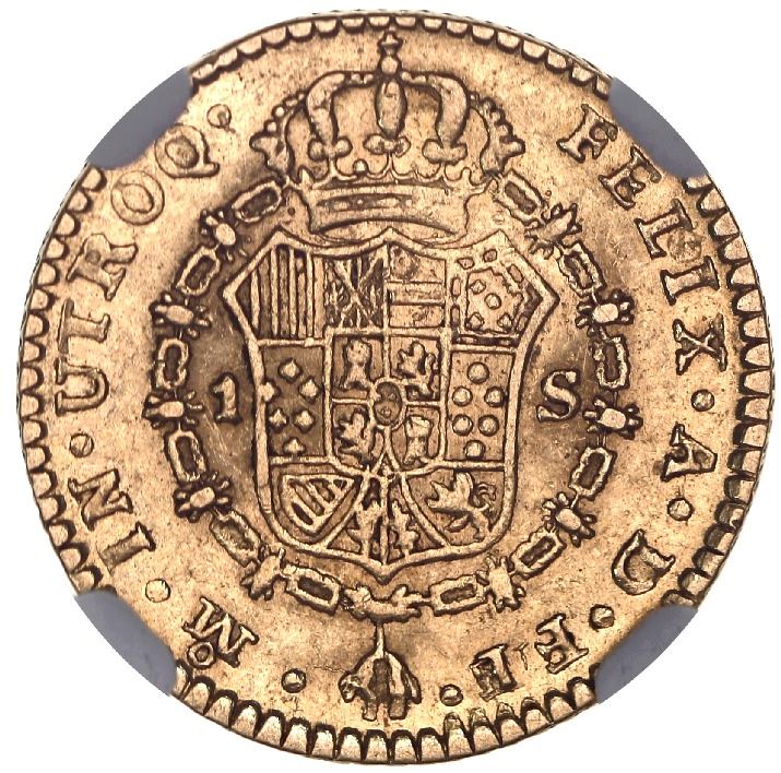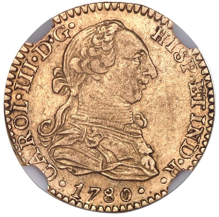Mexico City, Mexico, gold bust 1 escudo, Charles III, 1780FF/M, unlisted over-assayer, NGC AU 53. Cal-un (134 for Type); KM-unl (Type 118.2). Fully detailed but not overly bold, muted luster but minimal wear, with bold over-assayer that is known but unlisted in references, second finest in NGC census behind a single AU 58. NGC #4916867-003.