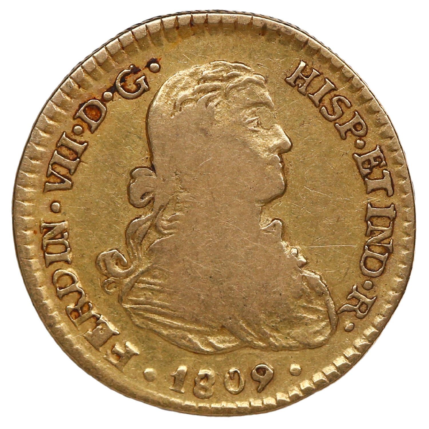 Mexico City, Mexico, gold bust 1 escudo, Ferdinand VII transitional ("armored" bust), 1809 HJ/TH.