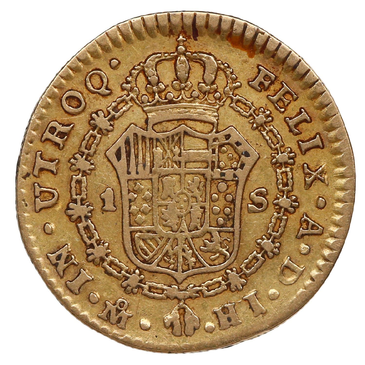 Mexico City, Mexico, gold bust 1 escudo, Ferdinand VII transitional ("armored" bust), 1809 HJ/TH. KM-121; Cal-1510; Fr-49. 3.33 grams. AVF with much wear on the bust but other details rather sharp, first year of issue for this popular three-year transitional type plus a tough over-assayer as well.