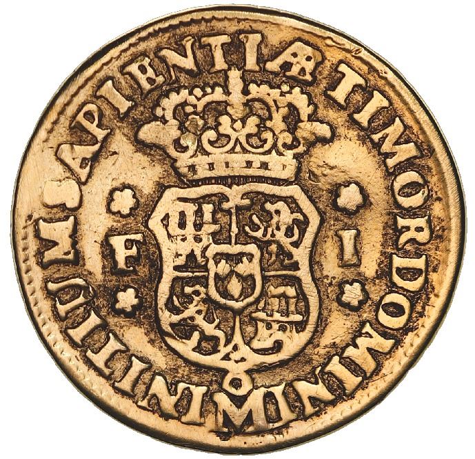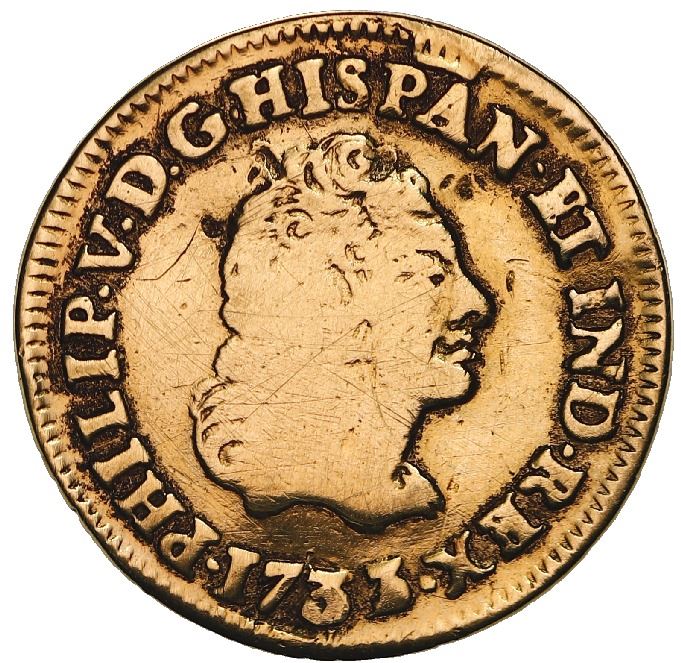 Mexico City, Mexico, gold bust 1 escudo, Philip V, 1733/2F, very rare. Cal-1745; KM-113. 3.15 grams. Broad-flan XF with small dents, scratches and polished surfaces (ex-jewelry), also with lightly re-engraved edge and plugged hole at bottom (the mintmark and penultimate 3 of date contrived thereon), but the final digit of the date with 3/2 original and clear and with contrasting toning around details, an important rarity that goes well into four figures in higher grade.