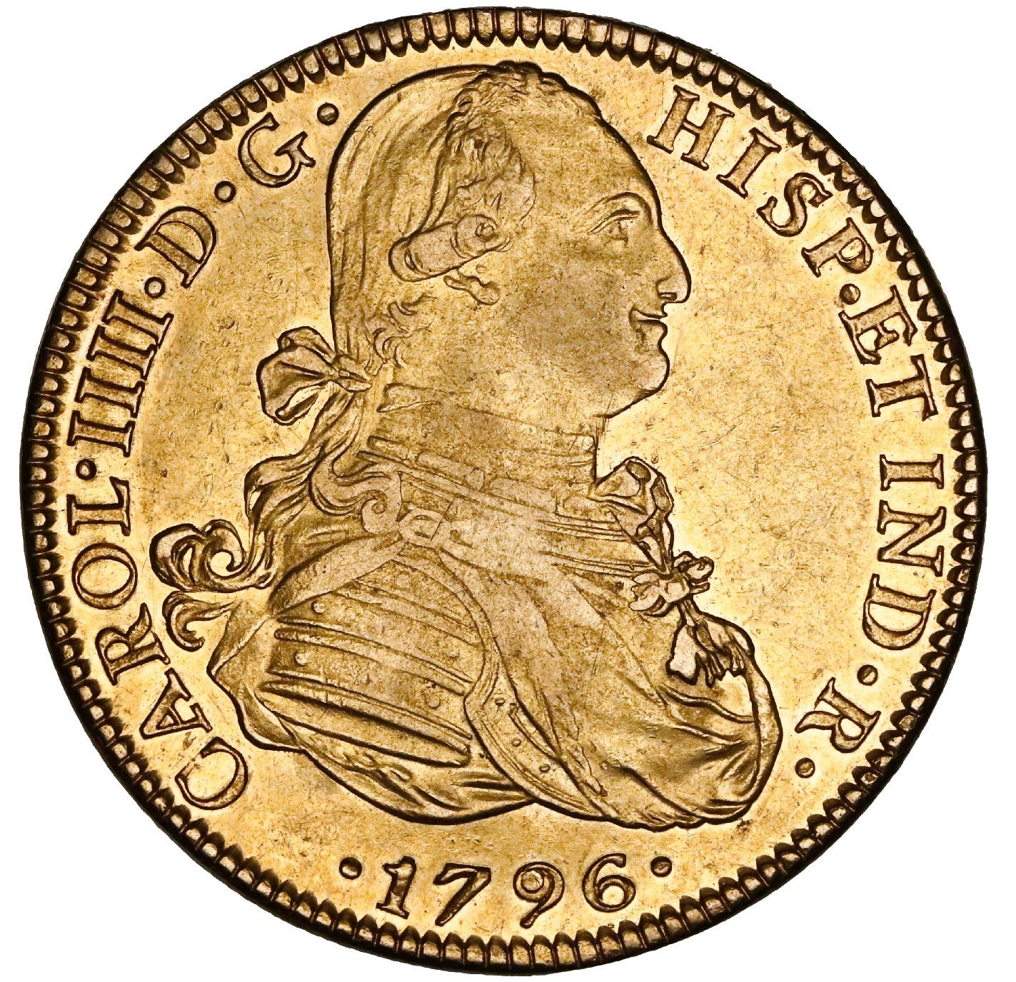 Mexico City, Mexico, gold bust 8 escudos, Charles IV, 1796FM, NGC AU 55. Cal-1636; KM-159. 27.00 grams. Lustrous and choice for the grade, with just light wear on bust and faint hairlines, full rims, nice yellow color. NGC #5934006-001.
