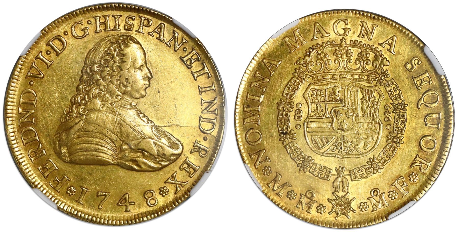 Mexico City, Mexico, gold bust 8 escudos, Ferdinand VI, 1748MF, NGC AU 55. Cal-781; KM-150. Bold strike with only light marks and high-point wear, luster in legends, faint adjustment marks on bust. NGC #4465606-001.