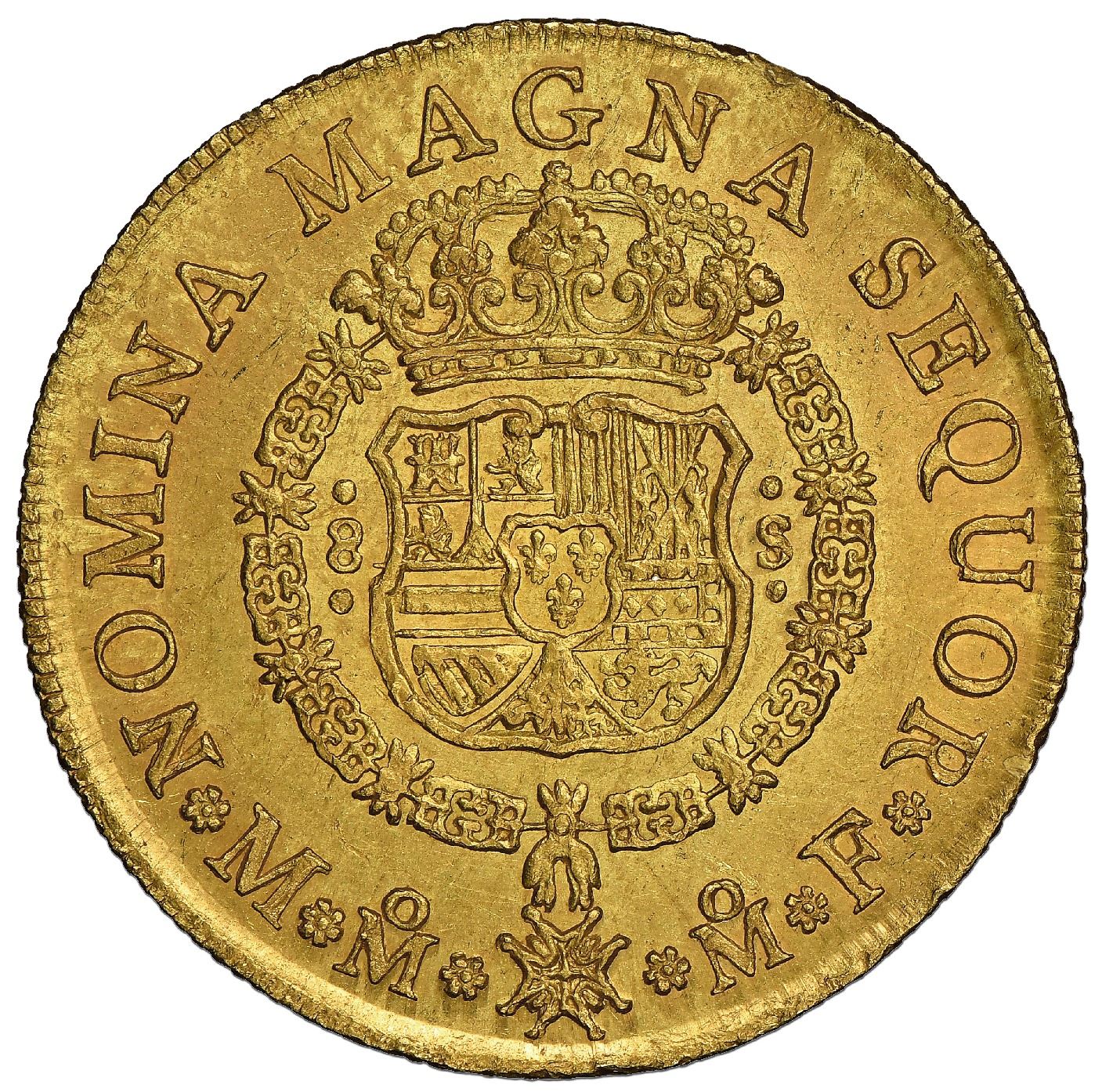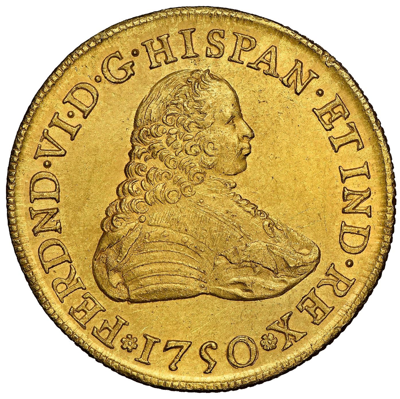 Mexico City, Mexico, gold bust 8 escudos, Ferdinand VI, 1750MF, NGC MS 62, finest known in NGC census. Cal-784; KM-150. Choice full strike and obverse rim (reverse rim weak at bottom), frosty surfaces (muted luster) with only minor bagmarks and no wear, just some tiny rim-nicks (under slab prongs) but otherwise very choice for the grade with sharp details all over, the single finest of seventeen at NGC. NGC #4916878-001.