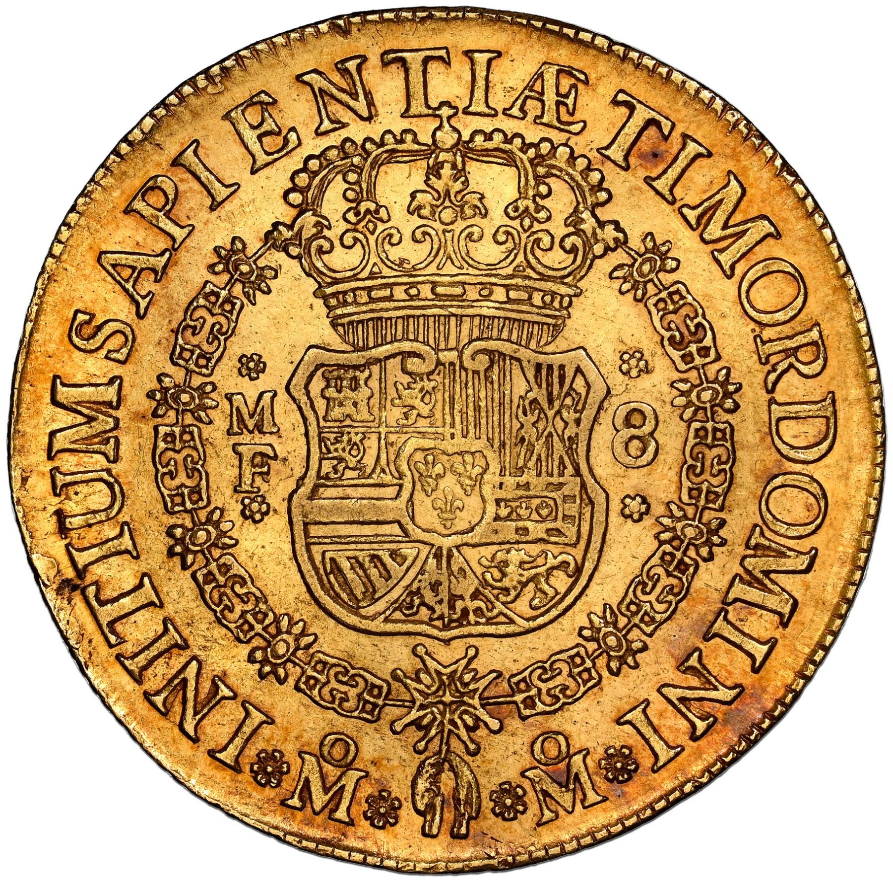 Mexico City, Mexico, gold bust 8 escudos, Philip V, 1743 MF, NGC AU 58. Cal-2247; KM-148. 26.99 grams Choice, sharp strike with high rims containing lustrous fields with a tinge of light red toning, faint surface hairlines on obverse, scarce early type.