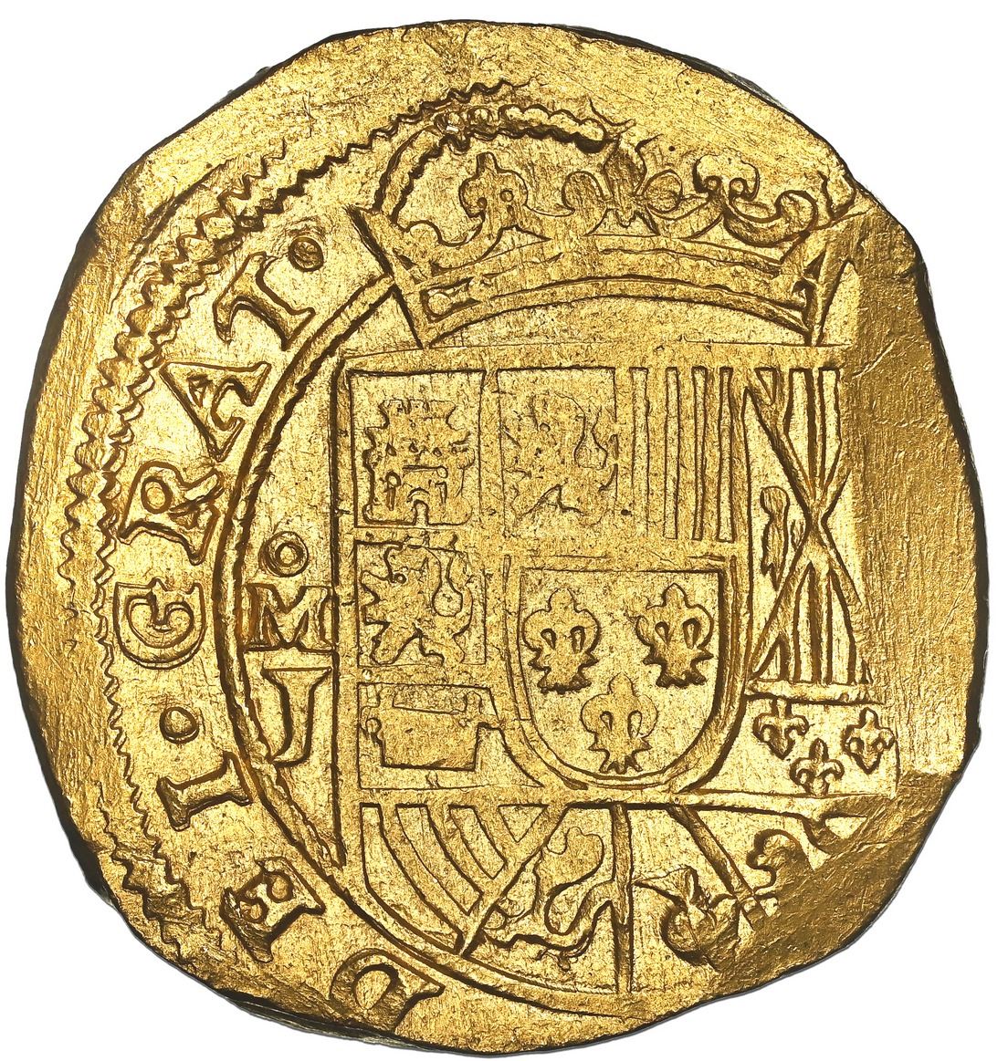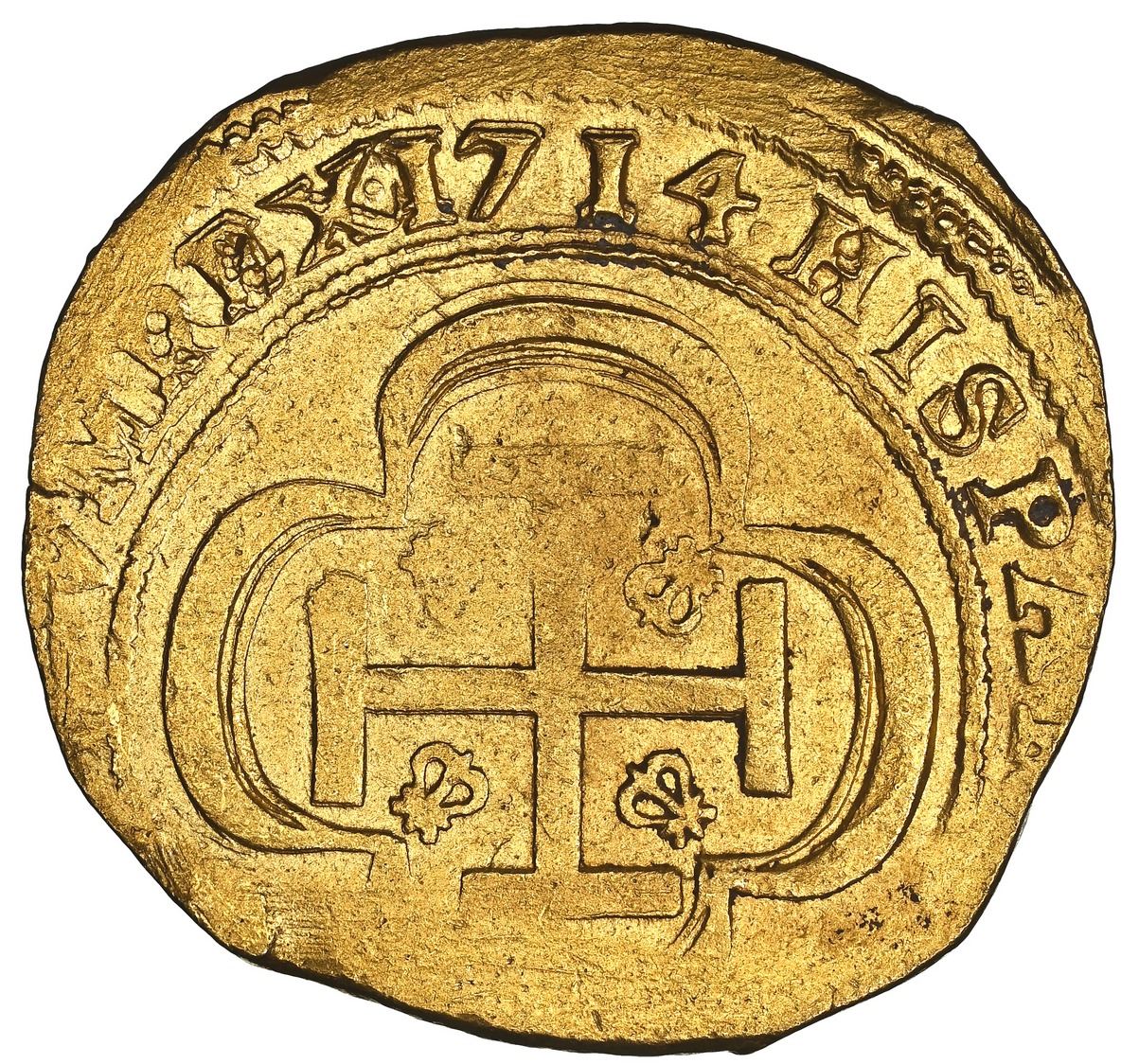 Mexico City, Mexico, gold cob 8 escudos, 1714 J, date on reverse (GRAT variety), NGC MS 62 (1715 Fleet Shipwreck Label), ex-Frank Sedwick, Practical Book of Cobs Plate Coin. S-M30; KM-57.2; Cal-2212. 26.60 grams. Rather lustrous and with full shield and cross (albeit both somewhat lightly struck), full crown, but best aspect is the very full and bold date on reverse and GRAT where the date normally appears on the obverse, desirable pedigree. NGC #6450210-001. From the 1715 Fleet, pedigreed to the Frank Sedwick Collection and plated on page 80 of the 2nd edition and page 105 of the 3rd edition of The Practical Book of Cobs (1990 and 1995 respectively)