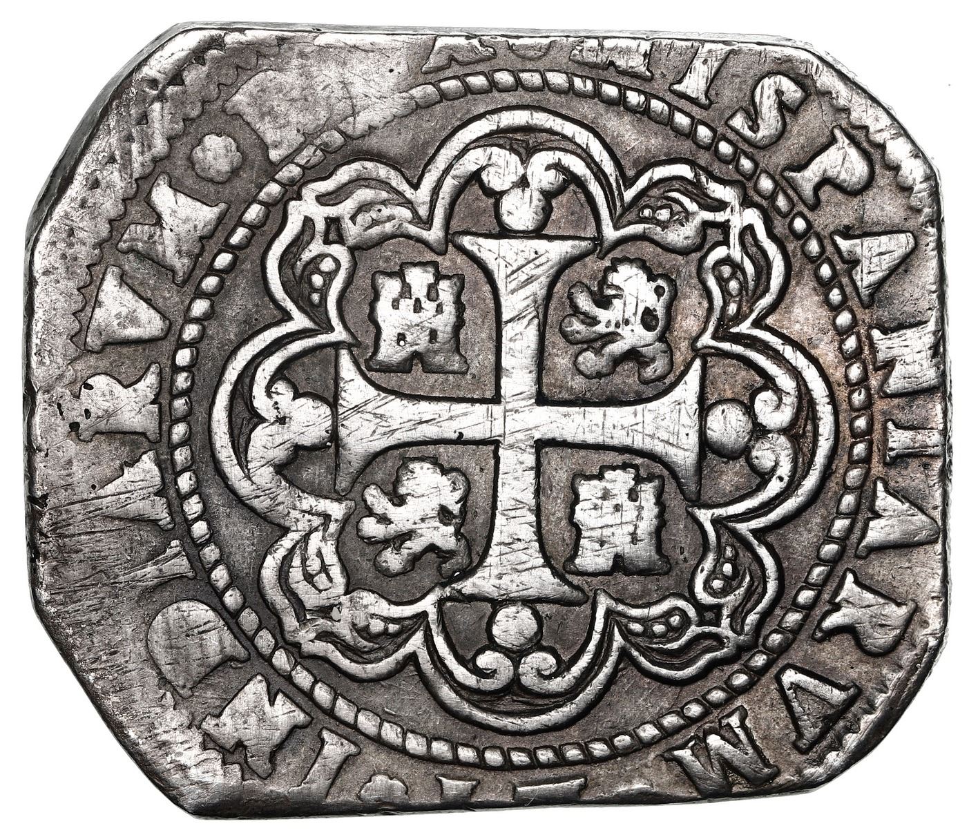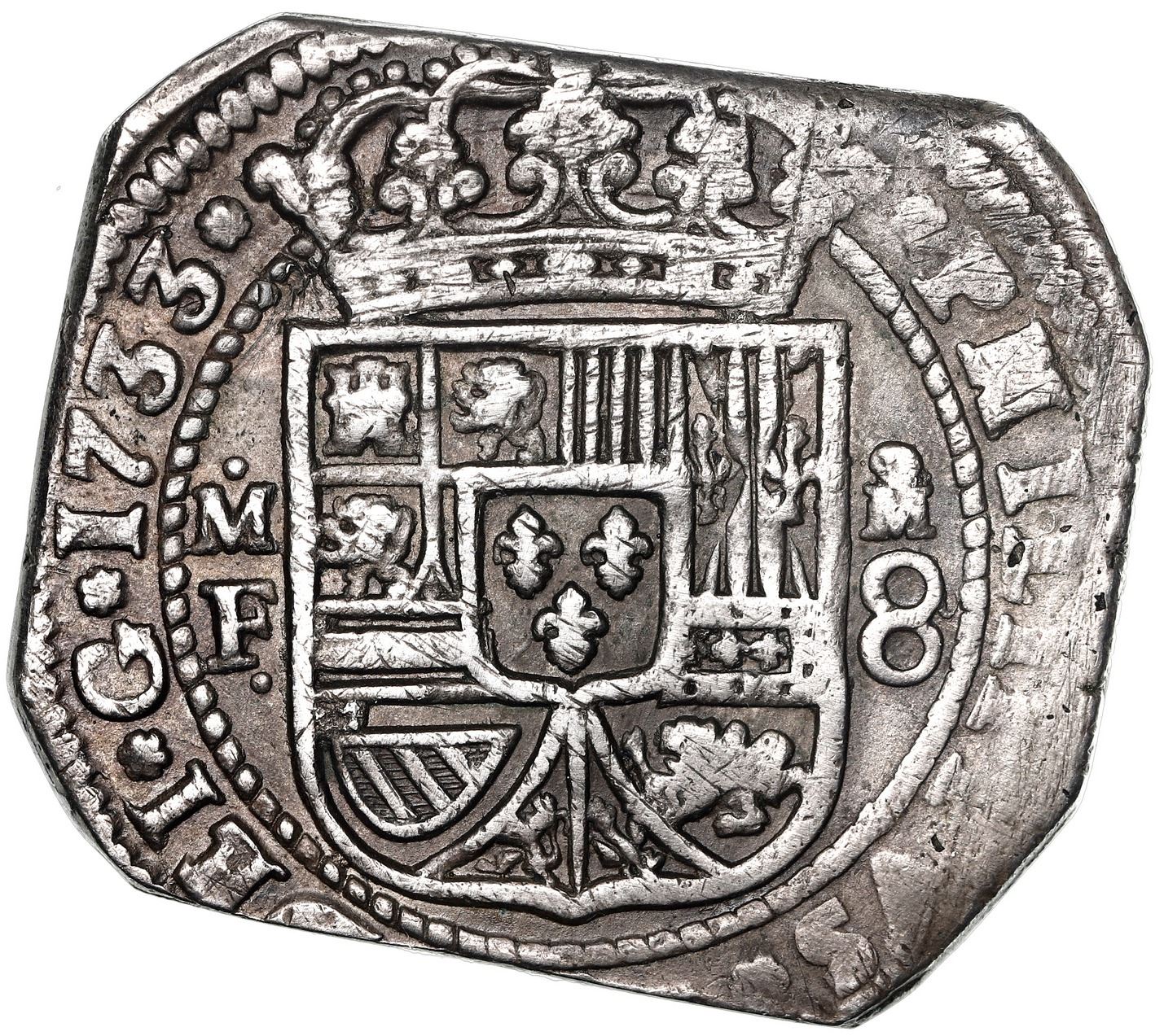 Mexico City, Mexico, klippe 8 reales, 1733 MF. S-M28; KM-48; Cal-1431. 24.36 grams. Choice full interiors and crown plus most of legends including full date, richly toned XF with faint adjustment marks on high points, probably shaved or filed on edge as underweight.