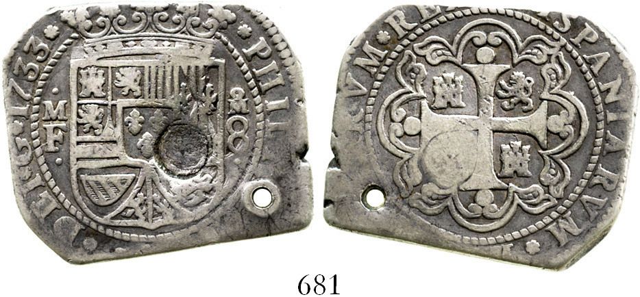 Mexico City, Mexico, klippe 8 reales, 1733MF, with circular countermark (possible contemporary counterfeit of Guatemala Type II of 1839). S-M28; KM-48; CT-768. 26.0 grams. Very squarish flan, which is typical, with all important details clear (date, assayer, mintmark, denomination), lightly toned AVF, with crude hole near one point and deep countermark on shield that shows practically no details inside.