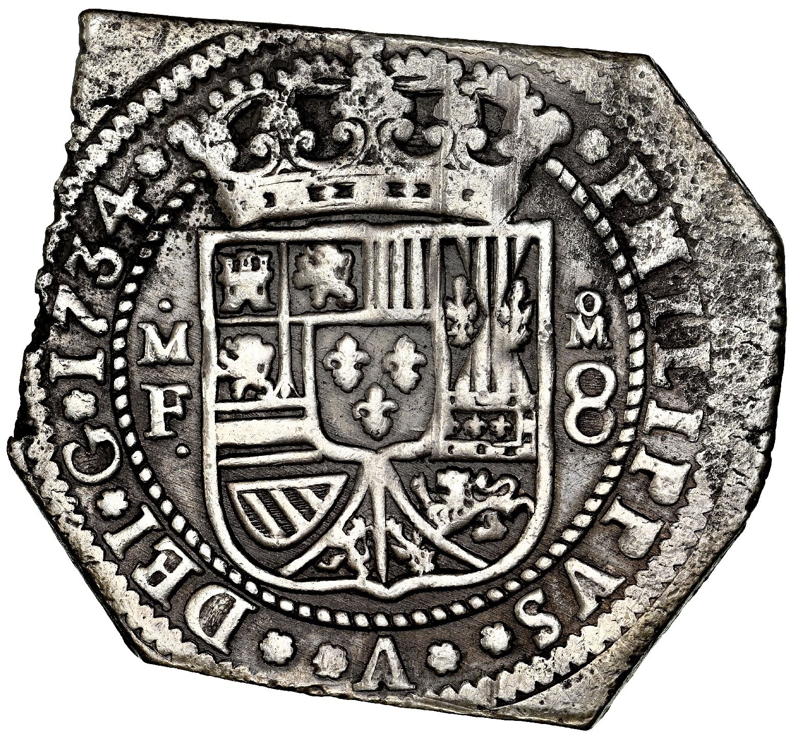 Mexico City, Mexico, klippe 8 reales, 1734 MF, NGC AU details / saltwater damage / Rooswijk (Shipwre