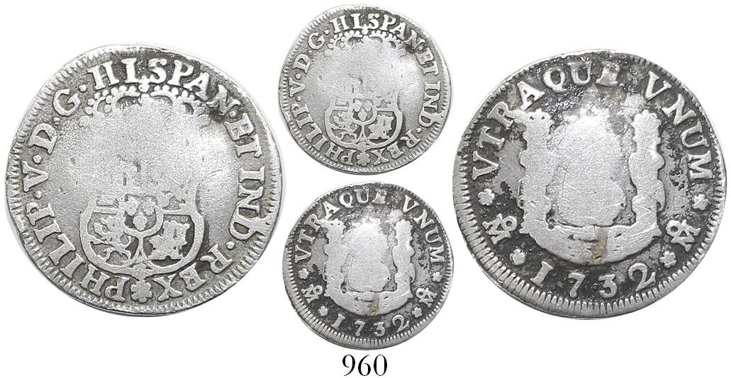 Mexico City, Mexico, pillar 1 real, 1732, no assayer or denomination, very rare first year. KM-75.1; CT-1592. 3.05 grams. About Fine with weak centers, dark encrustation around details (nice contrast), overall a decent specimen of a very hard-to-get first date. Pedigreed to the Ponterio auction of August 1996, with original lot-tag #994.