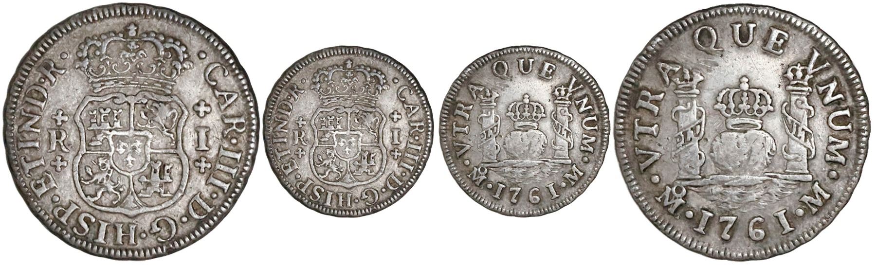 Mexico City, Mexico, pillar 1 real, Charles III, 1761M, plain crosses above and below R and I, rare.