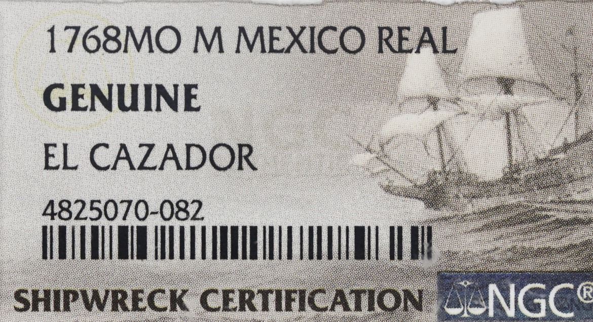 Mexico City, Mexico, pillar 1 real, Charles III, 1768M, broken o in mintmark, NGC genuine / El Cazador. KM-77; CT-1548. Saltwater corroded but fully detailed, dark toning in fields. With certificate #52575 from the salvagers. NGC #4825070-082. Recovered from: Cazador, sunk in 1784 off New Orleans, Louisiana
