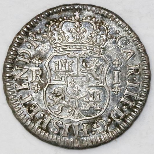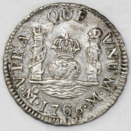 Mexico City, Mexico, pillar 1 real, Charles III, 1768M, broken o in mintmark.
