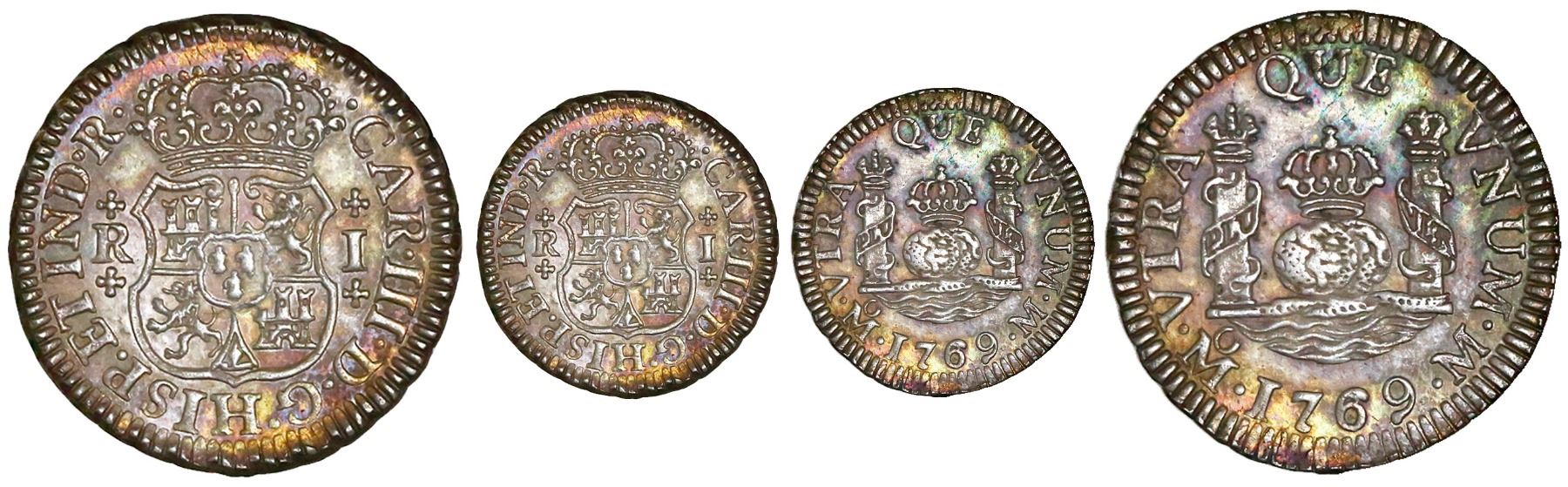 Mexico City, Mexico, pillar 1 real, Charles III, 1769M, broken o in mintmark. KM-77; CT-1549. 3.33 grams. Mint State with muted luster and vibrant, colorful toning, Gilboy M-1-45b (S2), Yonaka M1-69b (N). Pedigreed to the Potomac Collection of Mexican Pillars.