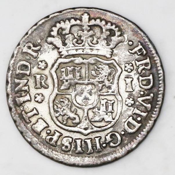 Mexico City, Mexico, pillar 1 real, Ferdinand VI, 1750/49M, very rare overdate, ex-Rudman. KM-unl (76.1 for type), CT-unl (cf. 575). 3.14 grams. Gilboy-M-1-23a (R3), Yonaka-M1-50a (R3). Polished XF, clear overdate (very rare in both major references), dark red and purple toning around rims. Pedigreed to the Isaac Rudman collection.