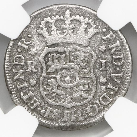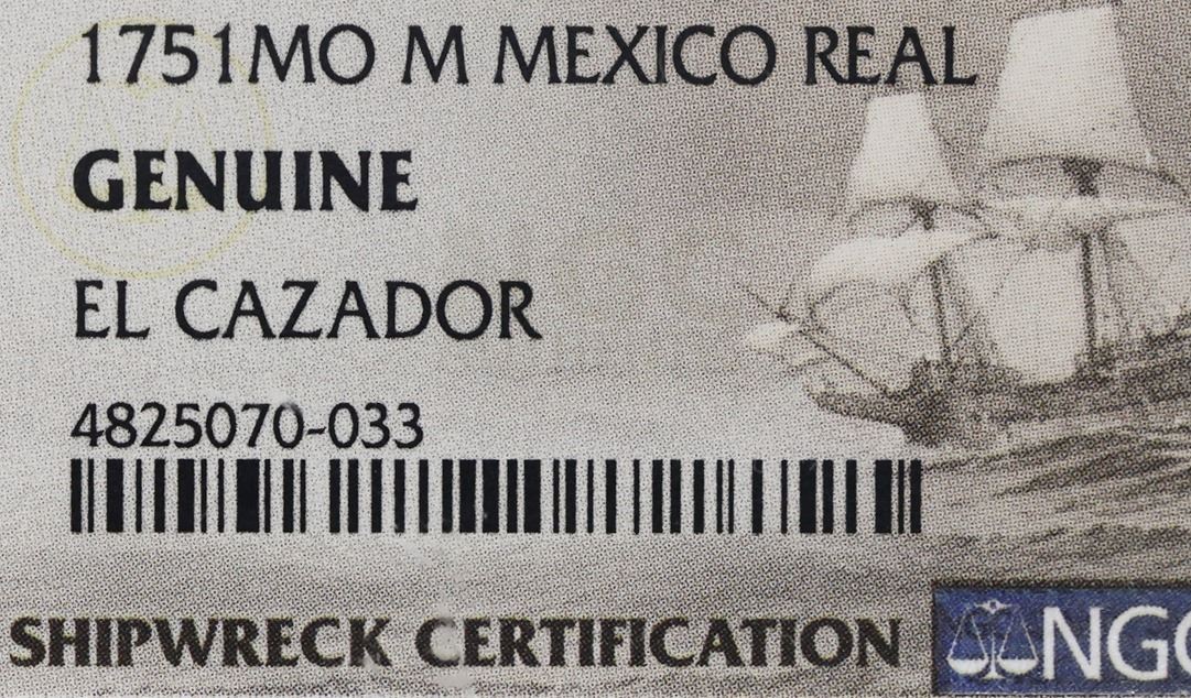 Mexico City, Mexico, pillar 1 real, Ferdinand VI, 1751M, NGC genuine / El Cazador. KM-76.1; CT-576. Nicer than most minor corrosion, possible lamination flaw on pillars side. With certificate #52526 from the salvagers. NGC #4825070-033. Recovered from: Cazador, sunk in 1784 off New Orleans, Louisiana
