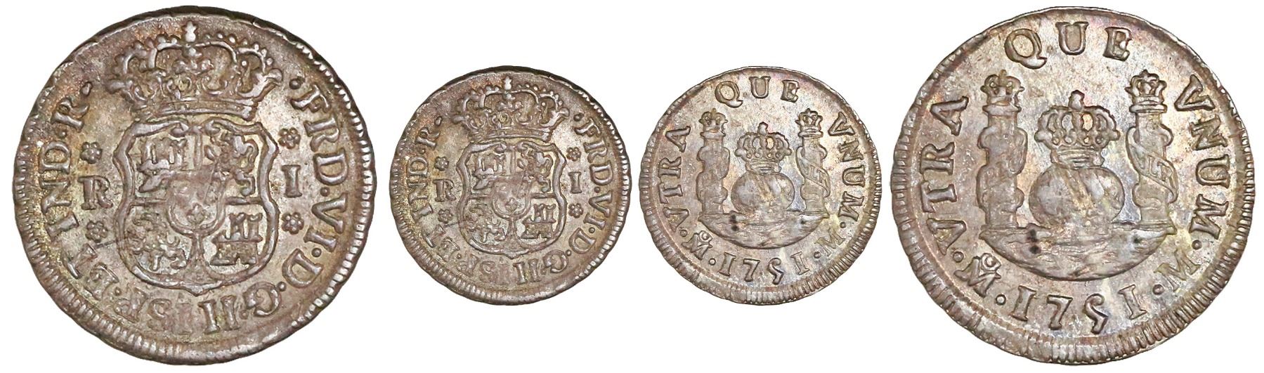 Mexico City, Mexico, pillar 1 real, Ferdinand VI, 1751M, unbarred-H variety. KM-76.1; CT-576. 3.35 grams. Lightly rainbow-toned AU with muted luster, Gilboy M-1-24a (S2), Yonaka M1-51b (N). Pedigreed to the Potomac Collection of Mexican Pillars.