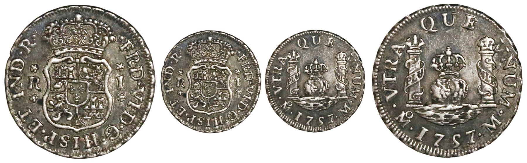 Mexico City, Mexico, pillar 1 real, Ferdinand VI, 1757M, dissimilar crowns, rare.