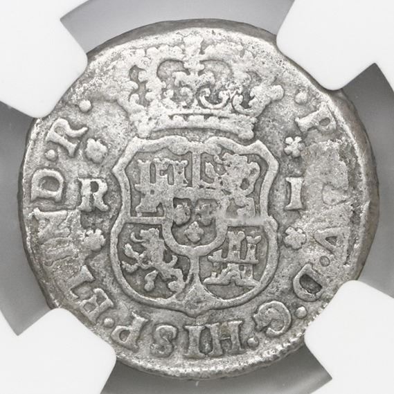 Mexico City, Mexico, pillar 1 real, Philip V, 1746M, NGC genuine / El Cazador. KM-75.2; CT-1608. Some surface corrosion, patch of horn silver on shield side. With certificate #52512 from the salvagers. NGC #4825070-016. Recovered from: Cazador, sunk in 1784 off New Orleans, Louisiana