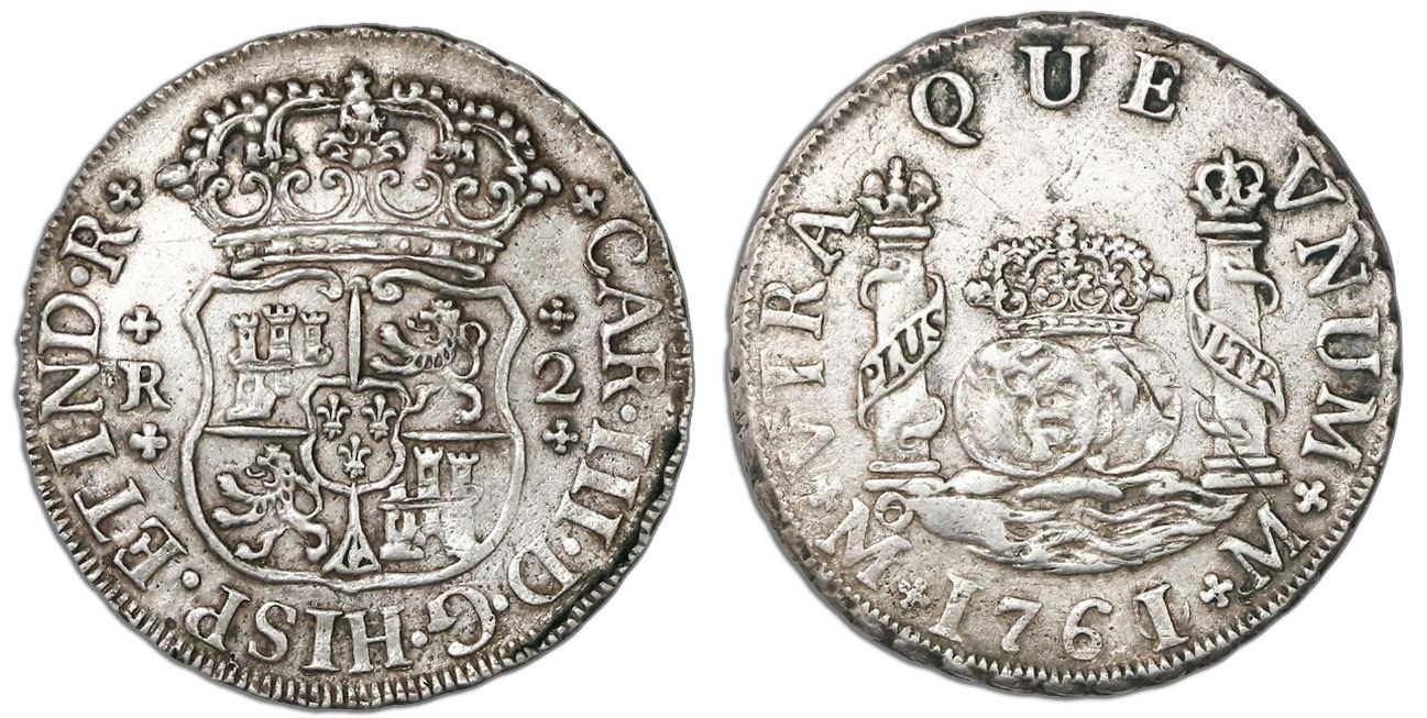 Mexico City, Mexico, pillar 2 reales, Charles III, 1761/0M, rare.