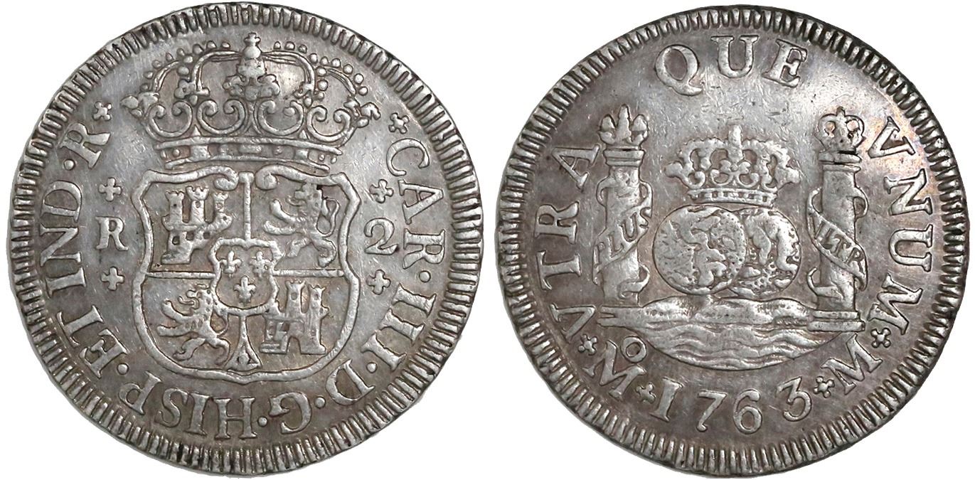 Mexico City, Mexico, pillar 2 reales, Charles III, 1763M. KM-87; CT-1328. 6.75 grams. Choice XF+ with traces of luster, very lightly toned.