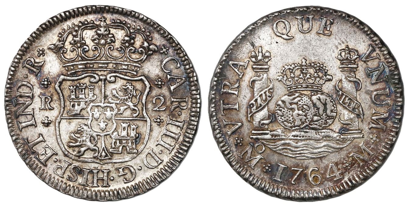 Mexico City, Mexico, pillar 2 reales, Charles III, 1764M. KM-87; CT-1329. 6.89 grams. Lustrous AU+ with attractive light rainbow toning. Gilboy-M-2-39 (N), Yonaka-M2-64 ( C). With NGC tag #3233262-014 (AU 53). Pedigreed to the Potomac collection of Mexican pillars.