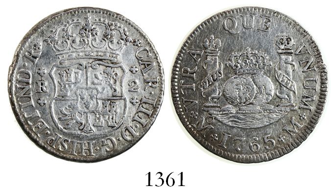 Mexico City, Mexico, pillar 2 reales, Charles III, 1765M. KM-87; CT-1330. 6.64 grams. Lightly cleaned XF, starting to tone around rims, one minor rim-flaw.
