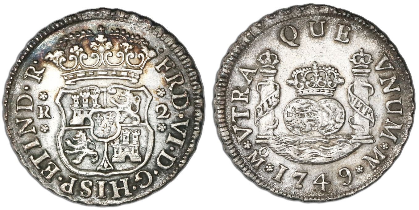 Mexico City, Mexico, pillar 2 reales, Ferdinand VI, 1749M, pellets at beginning and end of shield-side legend. KM-86.1; CT-489. 6.72 grams. AU-, once lightly cleaned but now with pretty rainbow toning developing at rims. Gilboy-M-2-22a (S), Yonaka-M2-49a (N). Pedigreed to the Potomac collection of Mexican pillars, and to the Ponterio auction of September 2004, with original lot-tag #443 (cut down).