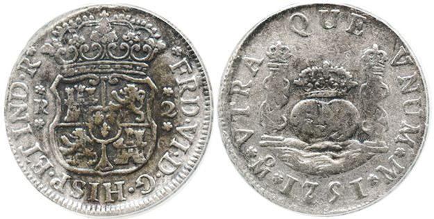 Mexico City, Mexico, pillar 2 reales, Ferdinand VI, 1751M, encapsulated ANACS "El Cazador SELECT." KM-86.1; CT-491. Virtually no corrosion, AVF details, patch of toning in center of shield side. Recovered from: Cazador, sunk in 1784 off New Orleans in the Gulf of Mexico