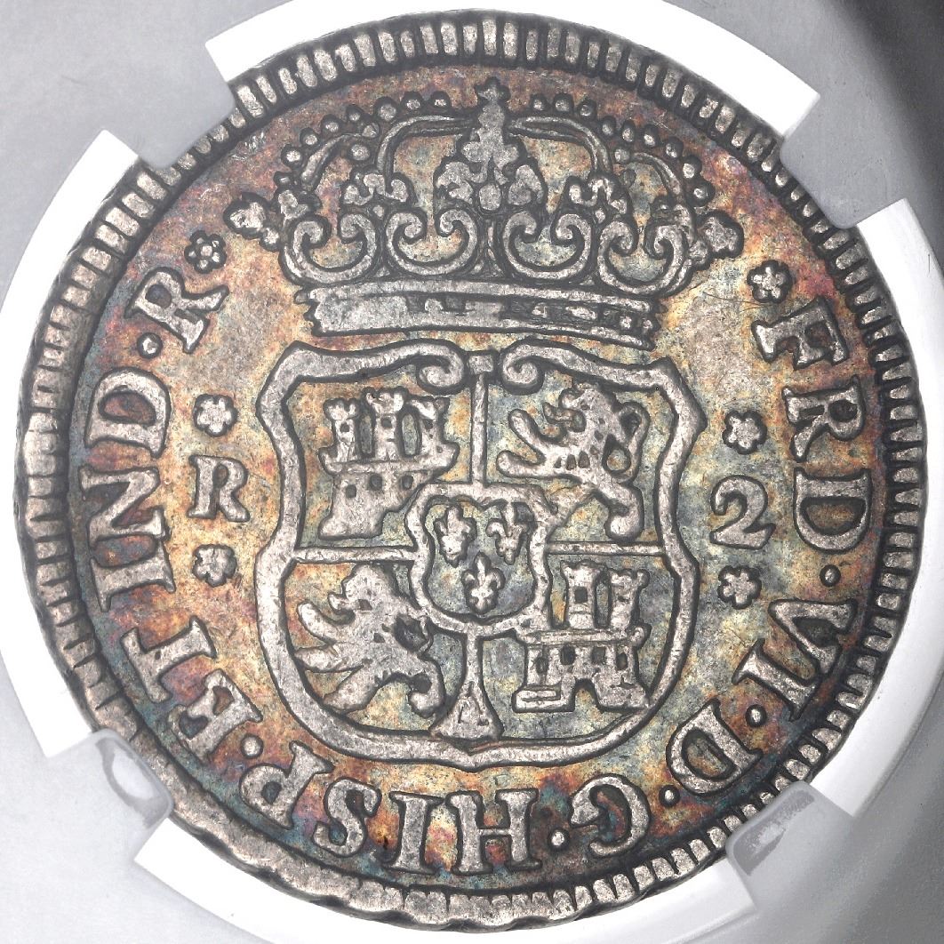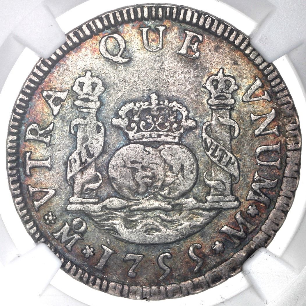 Mexico City, Mexico, pillar 2 reales, Ferdinand VI, 1755M, NGC XF 45. Cal-297; KM-86. Deep rainbow toned fields contrasting against the design, somewhat lustrous shield side. NGC #5718834-003.