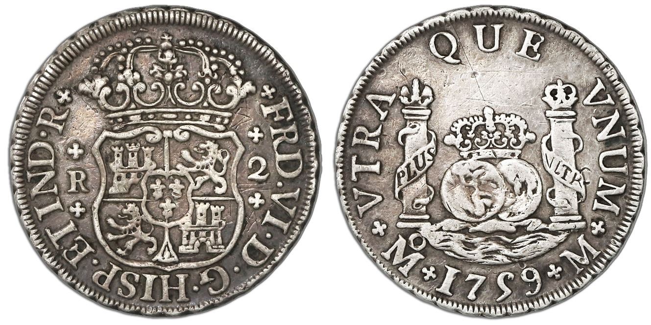 Mexico City, Mexico, pillar 2 reales, Ferdinand VI, 1759M, cross ornaments.
