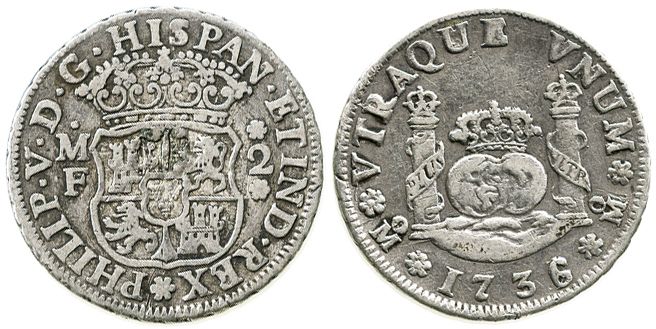 Mexico City, Mexico, pillar 2 reales, Philip V, 1736/5MF.