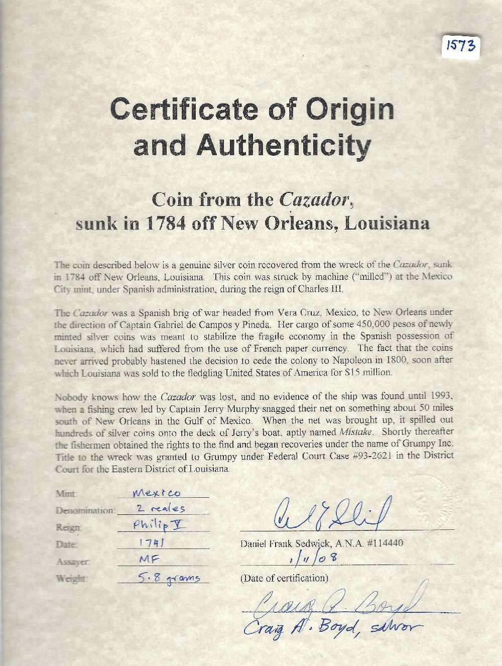 Mexico City, Mexico, pillar 2 reales, Philip V, 1741MF. KM-84; Cal-825. 5.83 grams. Nice VF details with very light surface corrosion, grayish silver color. With Sedwick certificate from 2008 also signed by the salvor (Craig A. Boyd). From: Cazador, sunk in 1784 off New Orleans, Louisiana