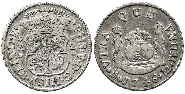 Mexico City, Mexico, pillar 2 reales, Philip V, 1746M. KM-85; CT-1299. 6.5 grams. Bold VF+ with very light toning, no problems.