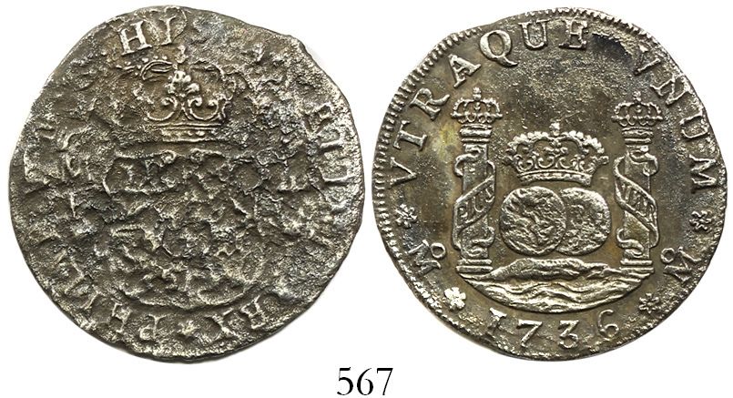 Mexico City, Mexico, pillar 4 reales, Philip V, 1736MF, normal date. KM-94; CT-1050. 9.24 grams. Sharp AU details on pillars side, the shield side heavily corroded, nicely toned all over. Pedigreed to the Reijgersdaal Research Collection. Recovered from: Reijgersdaal, sunk in 1747 off South Africa