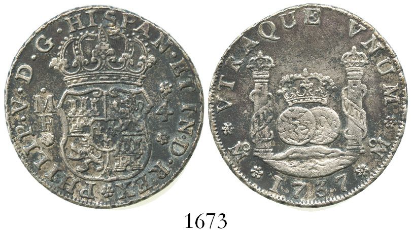 Mexico City, Mexico, pillar 4 reales, Philip V, 1737MF. KM-94; CT-1052. 13.2 grams. Bold XF details with uneven toning (mostly dark) and minor surface porosity as from unspecified salvage.