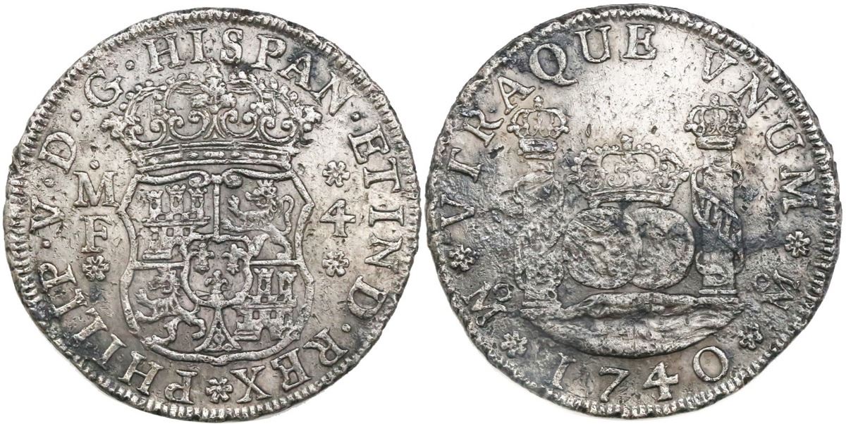 Mexico City, Mexico, pillar 4 reales, Philip V, 1740MF with 4/3. KM-94; CT-1056. 13.21 grams. UNC details with original luster but light surface corrosion and encrustation, incipient toning. Pedigreed to our Auction #18, with original lot-tag #475. Recovered from: Hollandia, sunk in 1743 off the Isles of Scilly, southwest of England