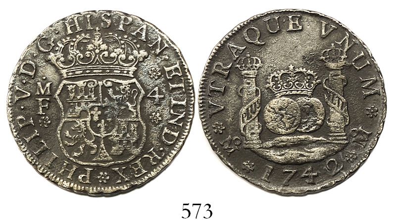 Mexico City, Mexico, pillar 4 reales, Philip V, 1742MF with 4/3, very rare.
