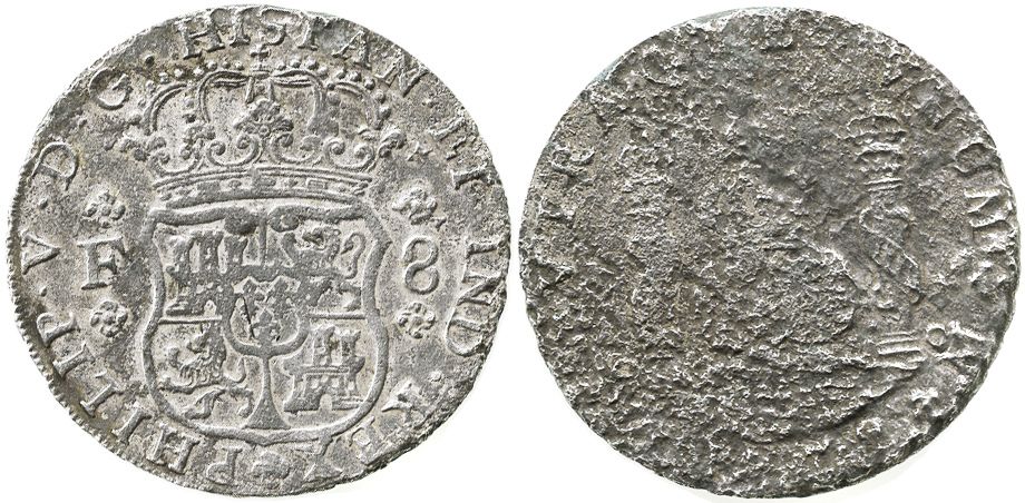 Mexico City, Mexico, pillar 8 reales, 1732F, very rare first year of series. KM-103; CT-774. 23.3 grams. Heavily corroded pillars side but shield side nice (light corrosion around edge only), toned all over. From the "Coffins Patch" site, with certificate #10445 from the salvagers. Recovered from: Spanish 1733 Fleet, Florida Keys