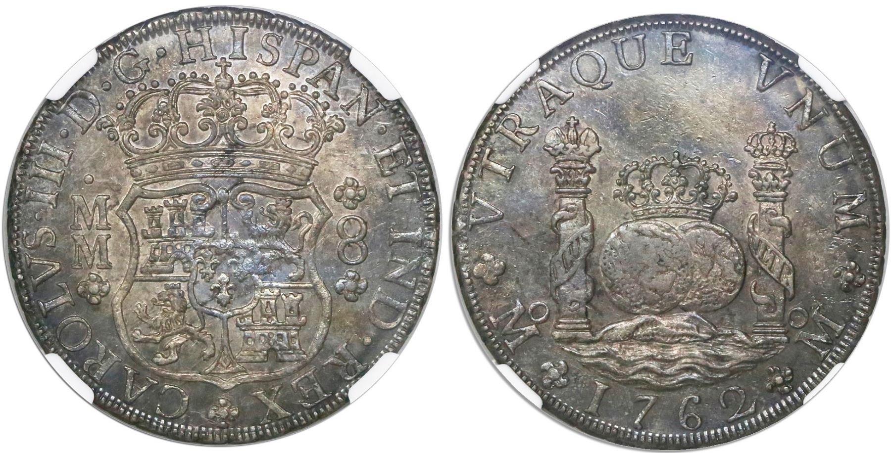 Mexico City, Mexico, pillar 8 reales, Charles III, 1762/1MM, rare, tip of cross between H and I, single-arc crown, encapsulated NGC MS 61, finest known in NGC census. KM-105; CT-890. Deep but uneven rainbow toning over muted luster, choice grade, in fact tops by three grades for this rare overdate (R3 in Gilboy, #M-8-40a). NGC #4427719-013.