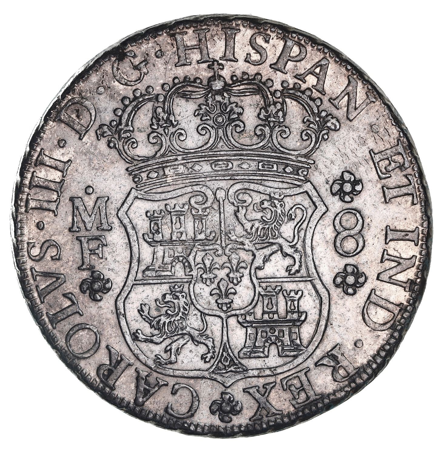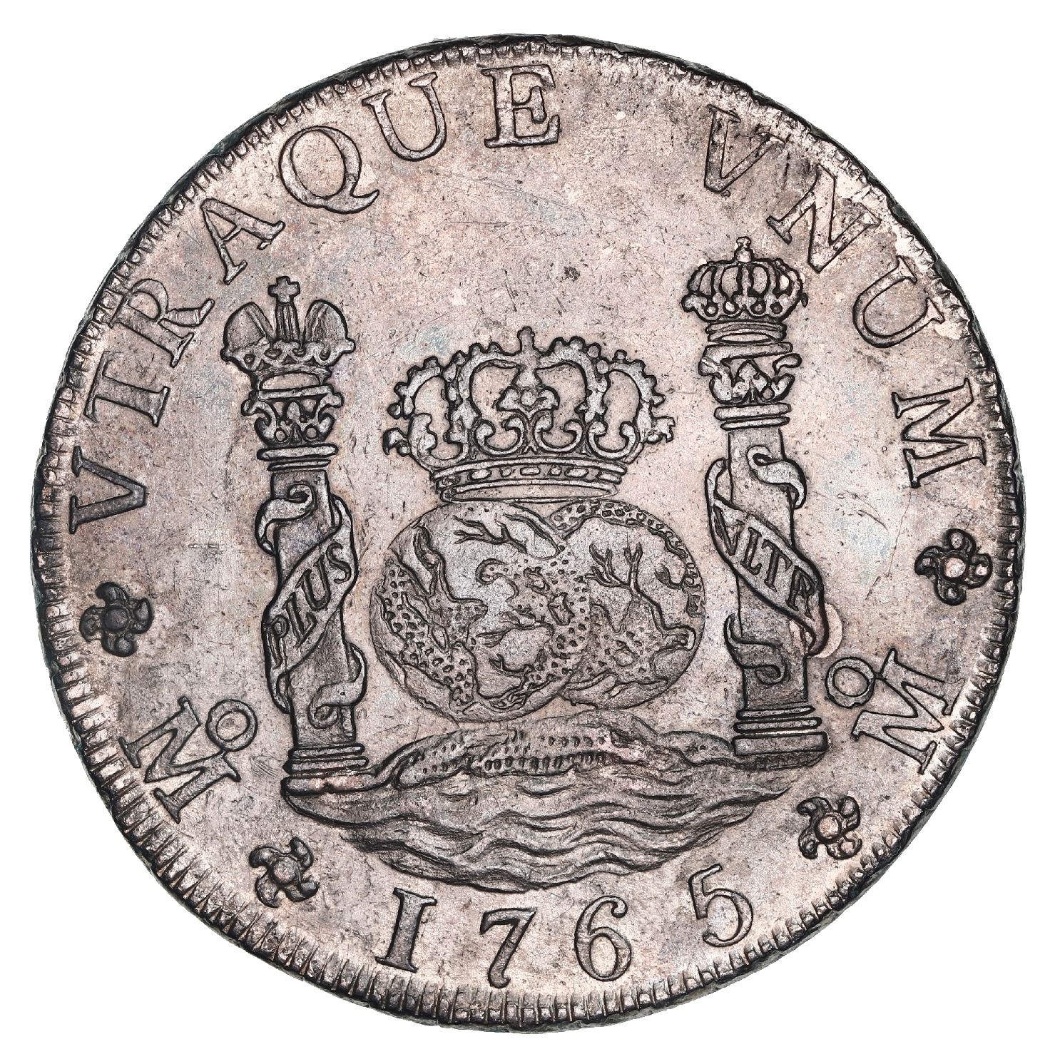 Mexico City, Mexico, pillar 8 reales, Charles III, 1765MF, double-arc crown (rare).