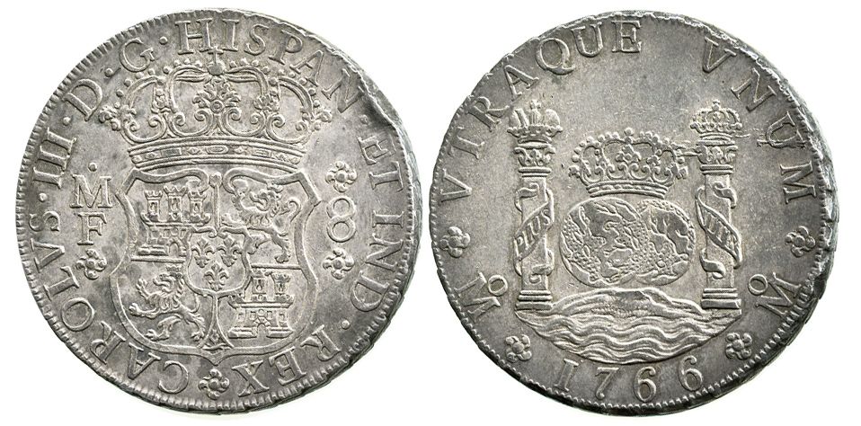 Mexico City, Mexico, pillar 8 reales, Charles III, 1766MF.