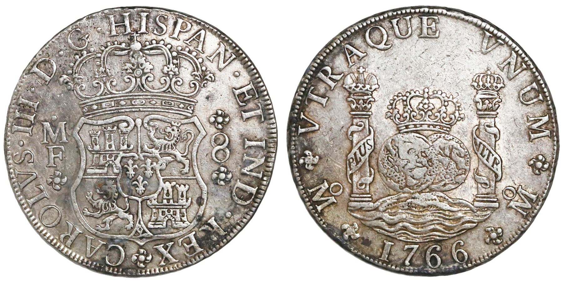 Mexico City, Mexico, pillar 8 reales, Charles III, 1766MF.
