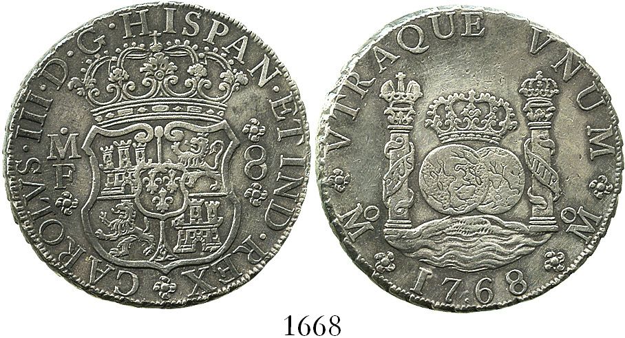 Mexico City, Mexico, pillar 8 reales, Charles III, 1768MF, rare variety with : in middle of date (17:68). KM-unl; CT-unl; Gilboy-M-8-48c. 26.8 grams. Small-flan XF with light rainbow-toning all over, the mysterious double-dot ornament in the date quite clear, rated as R4 in Gilboy.